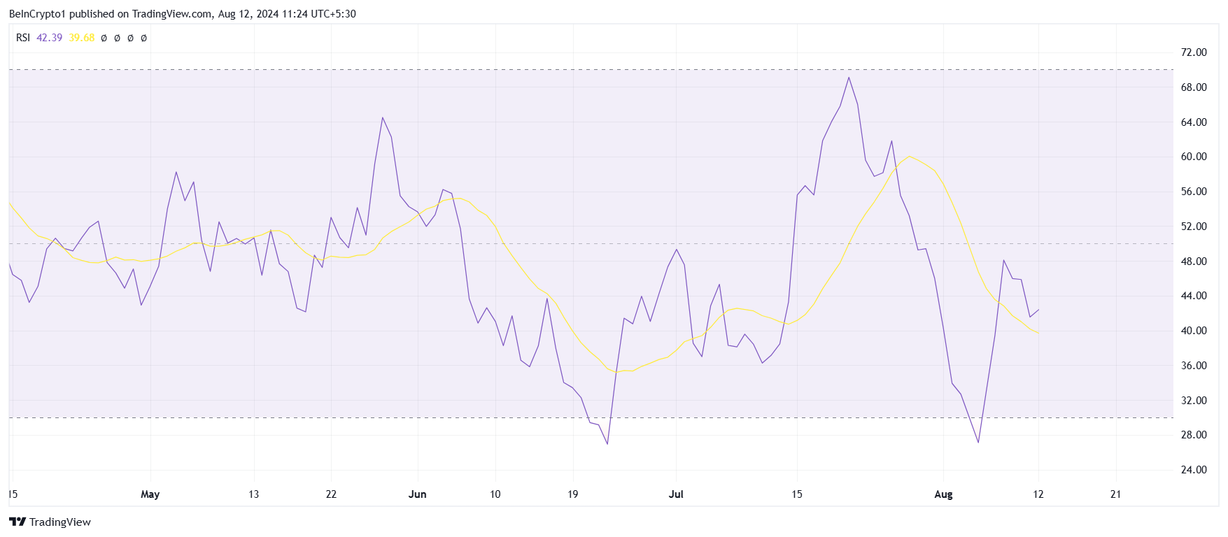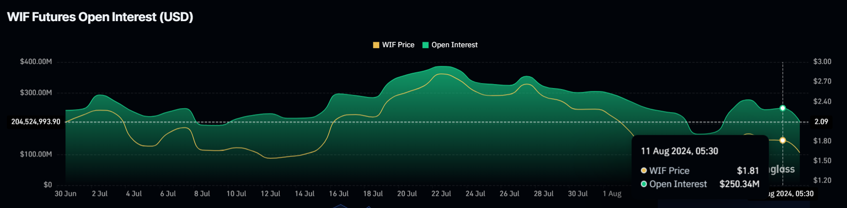 Lisäten karhumarkkinatunnelmaa, suhteellinen vahvuusindeksi (RSI) näyttää kamppailevan negatiivisella alueella. Vaikka WIF-hinnan äskettäinen palautuminen on tapahtunut, RSI ei ole onnistunut ylittämään neutraalia viivaa, mikä viittaa jatkuvasti heikkoon markkinatilanteeseen.