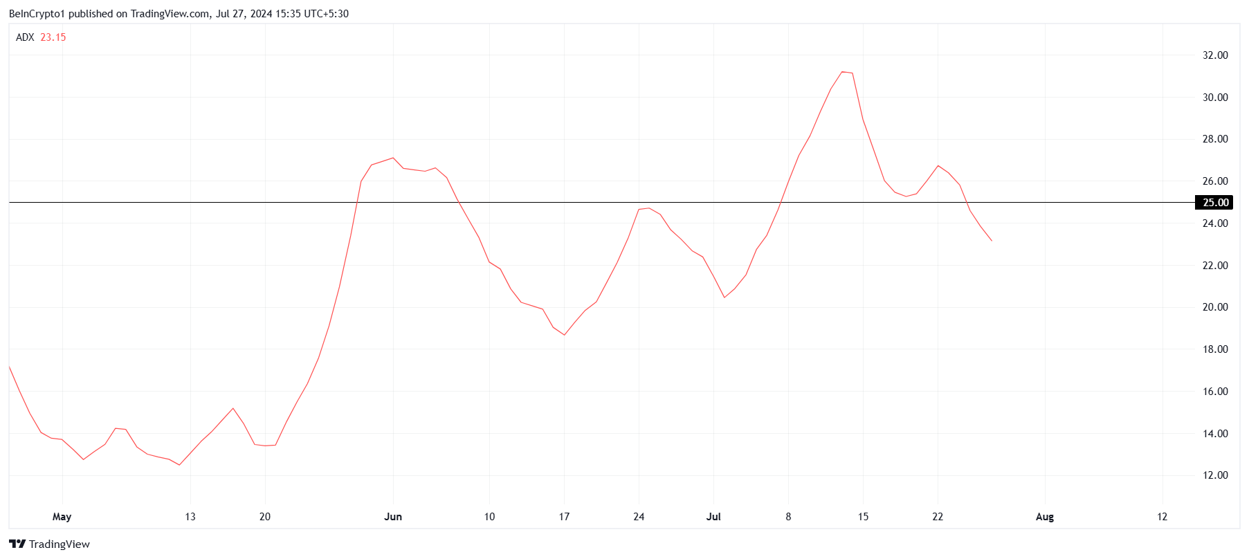 WIF-hinta yrittää saavuttaa merkittävän rallin, jolla meemikolikko oli ennen kuin se suistui raiteiltaan laajempien markkinavihjeiden vuoksi. Tämä näkyy keskimääräisen suuntaisuusindeksin (ADX) muutoksessa, joka on alle 25.0 kynnysarvon.