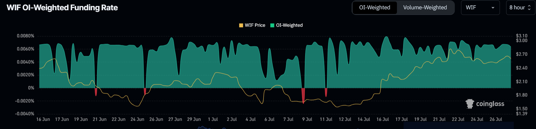 Huolimatta hinnannousun hidastumisesta, WIF:n rahoitusaste pysyy jatkuvasti korkeana. Tämä on kriittinen indikaattori sijoittajien yleisestä tunnelmasta. Korkea rahoitusaste viittaa yleensä siihen, että omaisuusvaralla on merkittävä kysyntä, jota ajaa sijoittajien optimismi sen tulevasta suorituskyvystä.