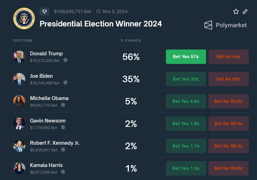 Tiedot kryptopohjaisista ennustemarkkinoista Polymarket osoittavat, että Trumpilla on 56 prosentin mahdollisuus voittaa marraskuun presidentinvaalit. Samaan aikaan Bidenilla on vain 35 prosentin mahdollisuus.