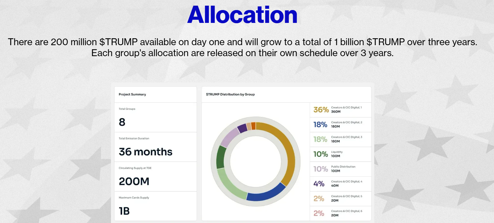 Loput 80 % on jaettu kuudelle ryhmälle, mukaan lukien CIC Digital Groups, Trumpin luottamuksen omistama yritys, joka on aiemmin hallinnoinut hänen NFT-hankkeitaan.
