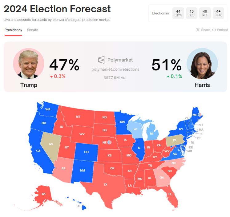 Huolimatta tästä tuesta, Trumpin vaalimahdollisuudet näyttävät heikkenevän. Polymarketin tietojen mukaan alan vedonlyöjät antavat Harrisille 51 % mahdollisuuden voittaa vaalit, ohittaen Trumpin 49 %:lla.