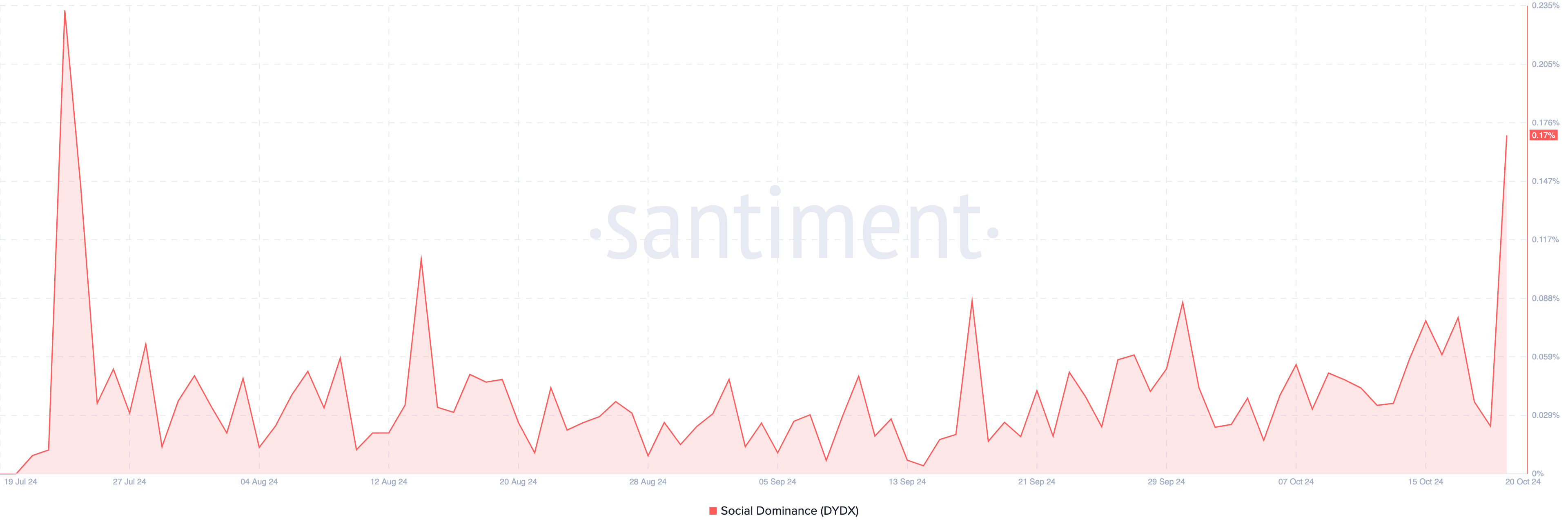 Päinvastoin, sosiaalisen dominanssin lasku osoittaa, että keskustelut DYDX:stä ovat ylittäneet muiden sadan parhaan kryptovaluutan keskustelut. Nykyisen trendin perusteella altcoin saattaa nousta yli 1,22 dollarin tulevina päivinä.