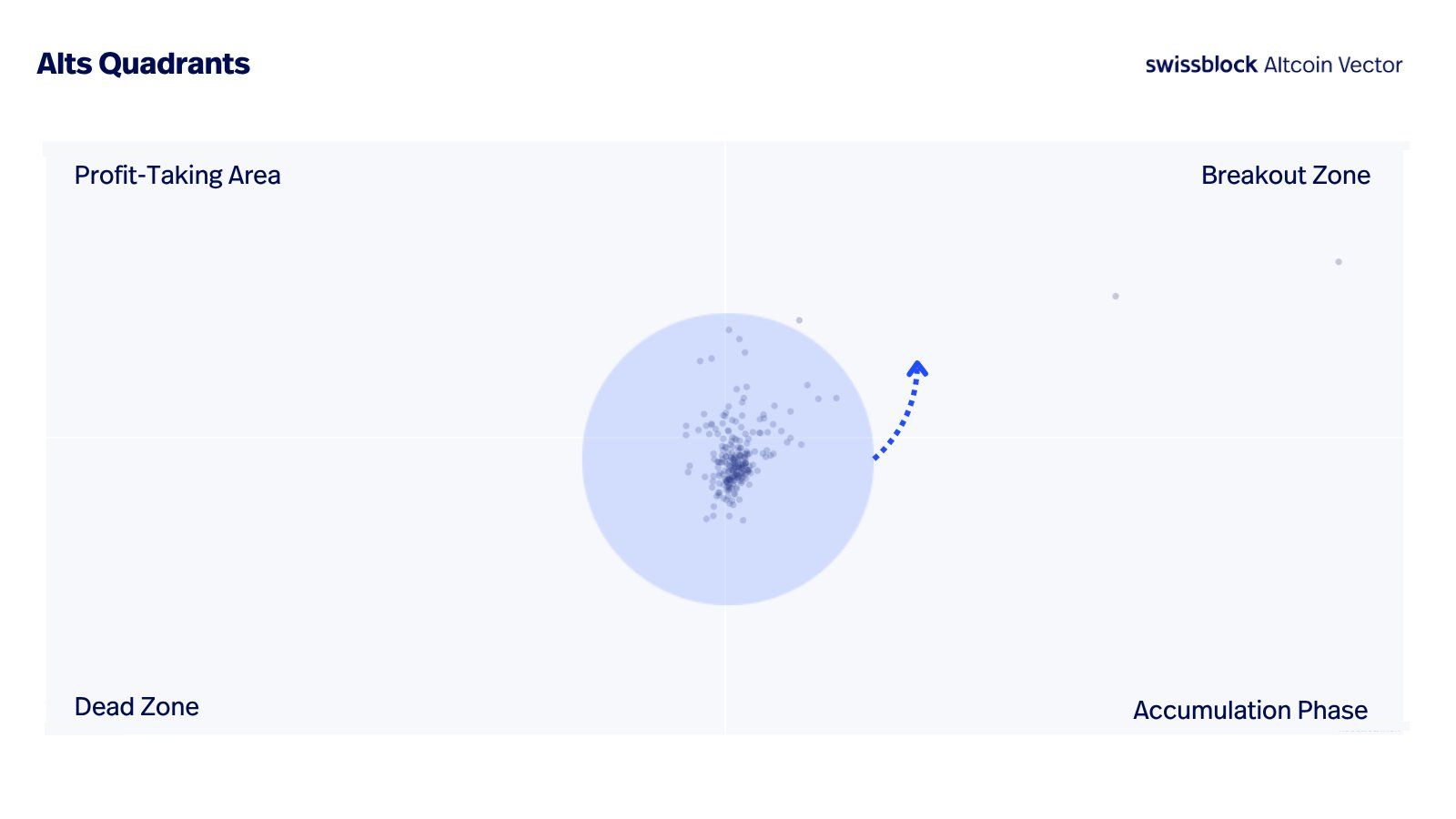 Raportti käyttää kvadranttikaaviota, joka jakaa altcoin-syklin neljään vaiheeseen. Heinäkuusta lähtien kaavio on liikkunut vastapäivään ja on nyt matkalla kohti “Breakout Zone” -aluetta.
