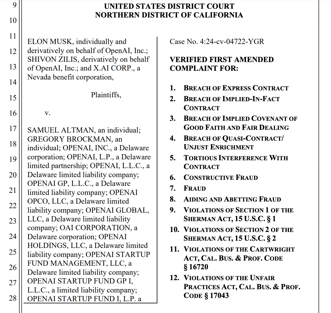 Viimeisimmässä oikeuden asiakirjassa Elon Musk nimesi useita uusia vastaajia meneillään olevassa oikeusjutussaan tunnetun tekoälyyrityksen OpenAI vastaan. Musk nimesi tässä muutetussa kanteessa entisiä OpenAI:n yhteistyökumppaneita ja sijoittajia, mukaan lukien Microsoftin. Hän syytti yhtiötä voittoa tavoittelemattoman keskittymisensä hylkäämisestä, mikä oli merkittävä syy Muskin alkuperäiseen sijoitukseen.