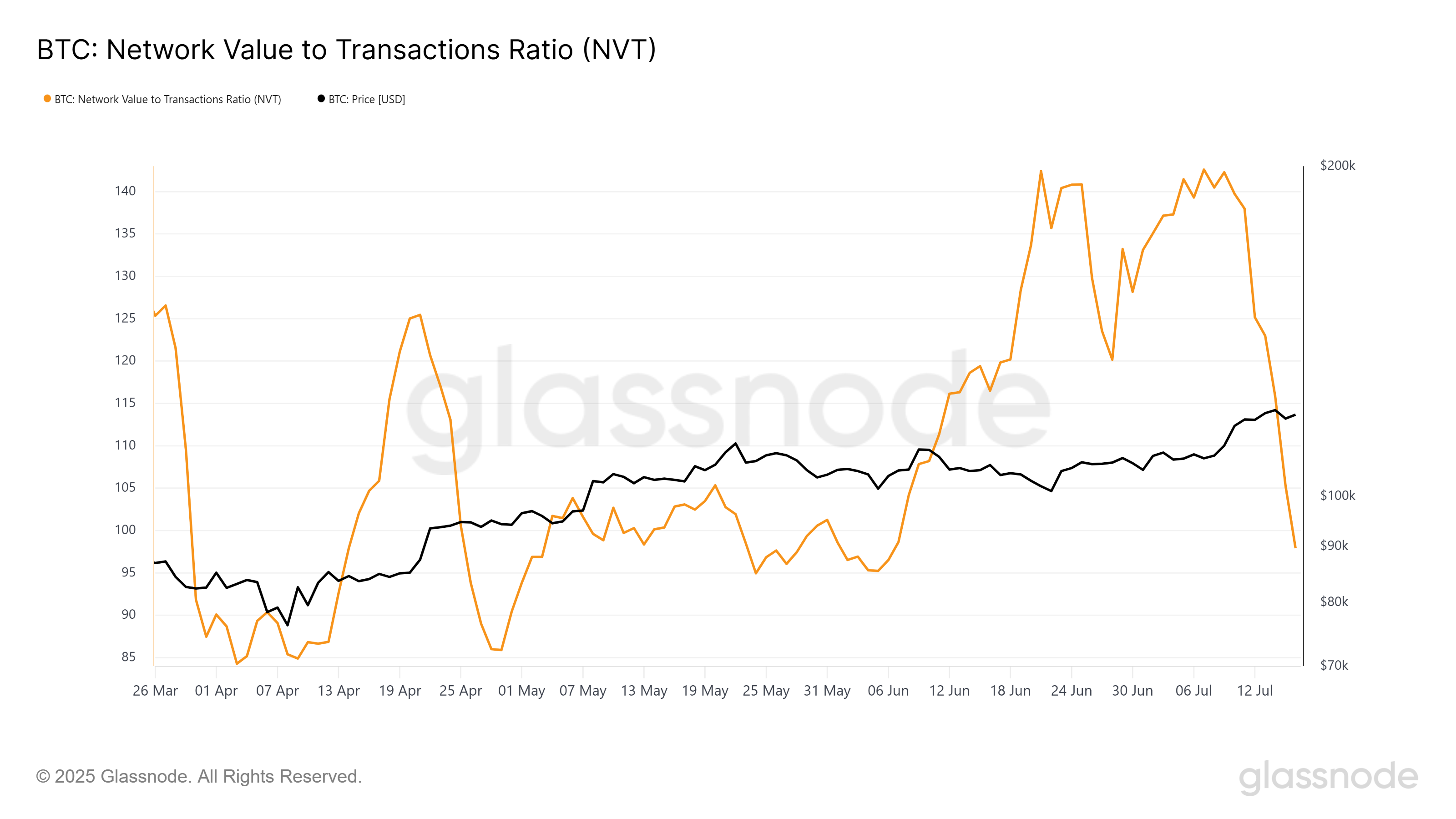 Network Value to Transaction (NVT) -suhdeluku nousi aiemmin tässä kuussa, seuraten samanlaista nousua kesäkuussa. NVT-suhdeluku mittaa verkon arvon ja transaktiotoiminnan välistä suhdetta.