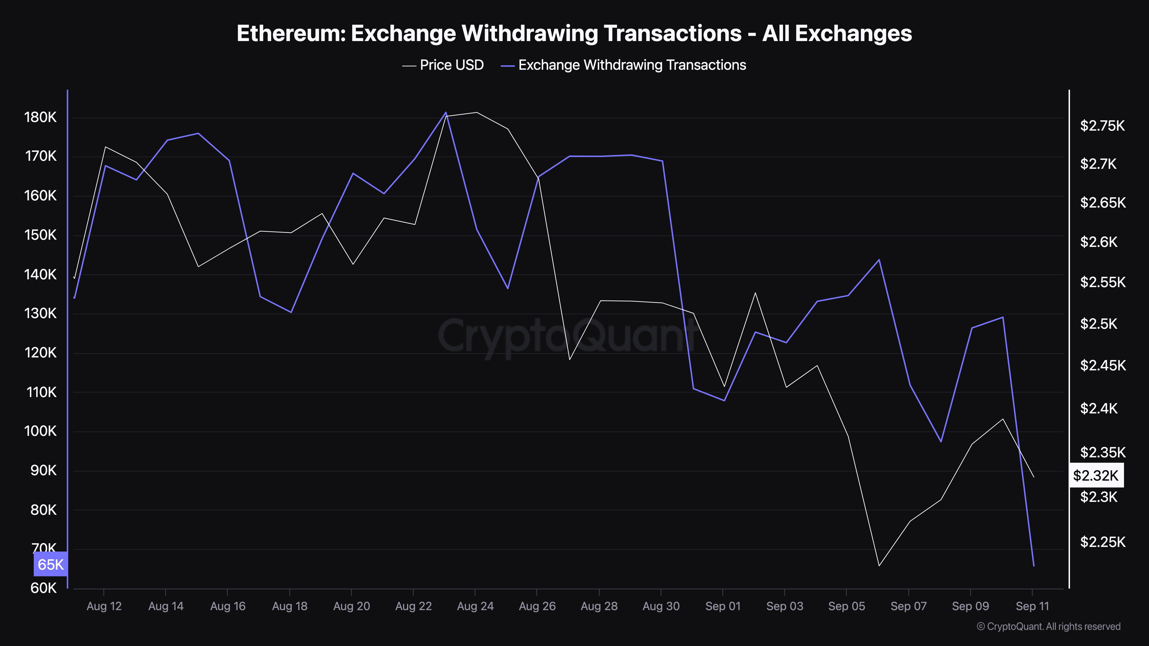 Kirjoitushetkellä Ethereum käy kauppaa 2 335 dollarilla, mikä merkitsee lähes 4 %:n laskua viimeisen seitsemän päivän aikana. CryptoQuantin tiedot paljastavat merkittävän pudotuksen ETH:n nostojen määrässä pörsseistä.