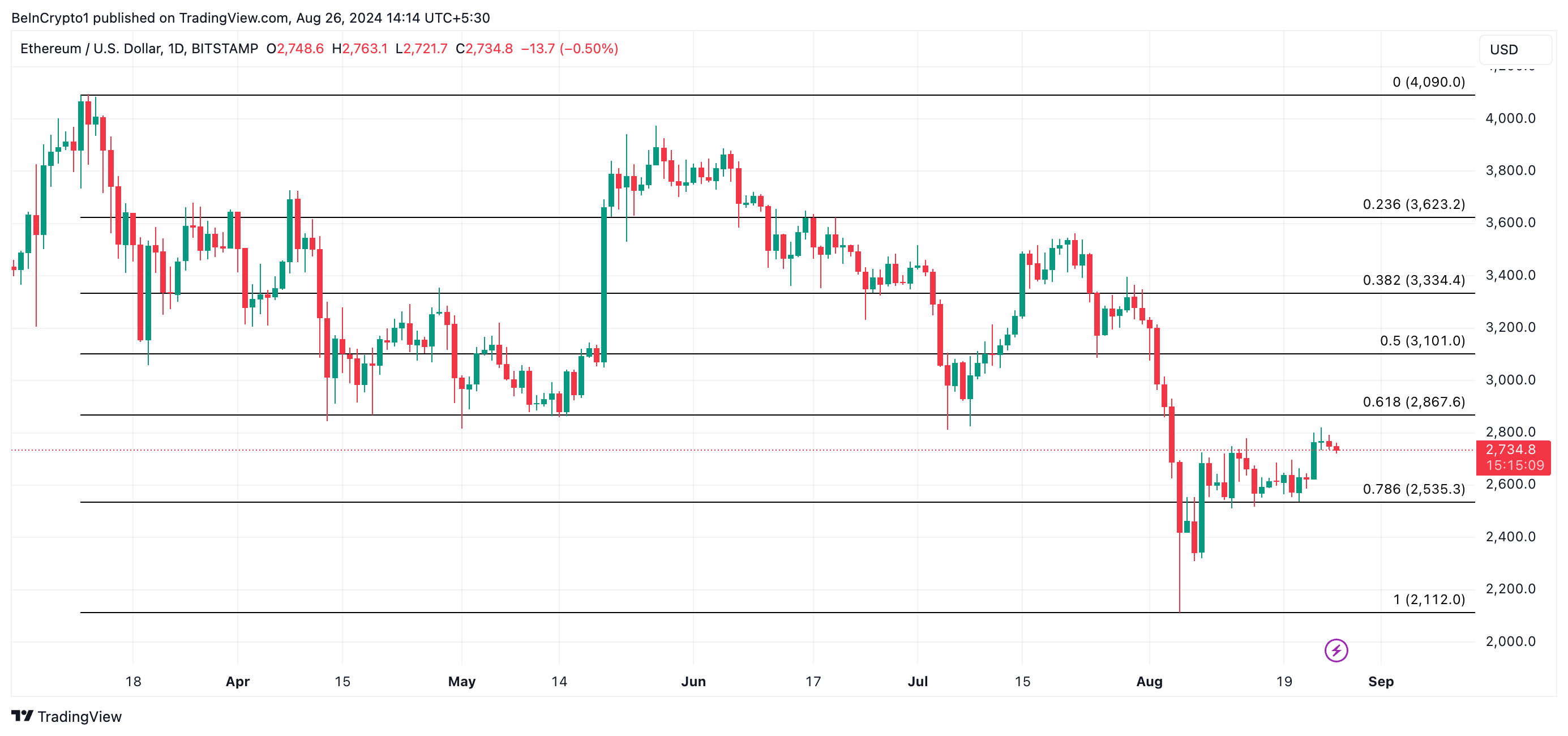 Lehdistöhetkellä ETH:n hinta on 2 742 dollaria, mikä heijastaa 15 %:n laskua viimeisen 30 päivän aikana laajemman markkinoiden laskun vuoksi. Viime päivinä markkinat ovat kuitenkin vakautuneet, osoittaen suhteellista tasapainoa ostojen ja myyntien paineiden välillä. Tämä näkyy tasaisena suhteellisena vahvuusindeksinä (RSI).