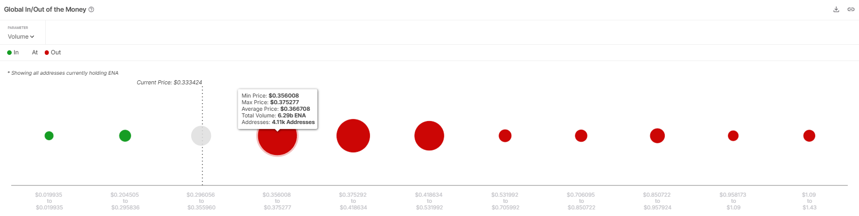 Ethena:n lisääminen Coinbase-suunnitelmaan on positiivinen kehitys, mutta se ei takaa välitöntä listautumista. ENA kohtaa edelleen haasteita sijoittajien luottamuksen puutteen vuoksi. GIOM (Global In/Out of the Money) -datan mukaan merkittävä tarjonta-alue on 0,356 ja 0,375 dollaria välillä, jossa yli 6,29 miljardia ENA:ta ostettiin.