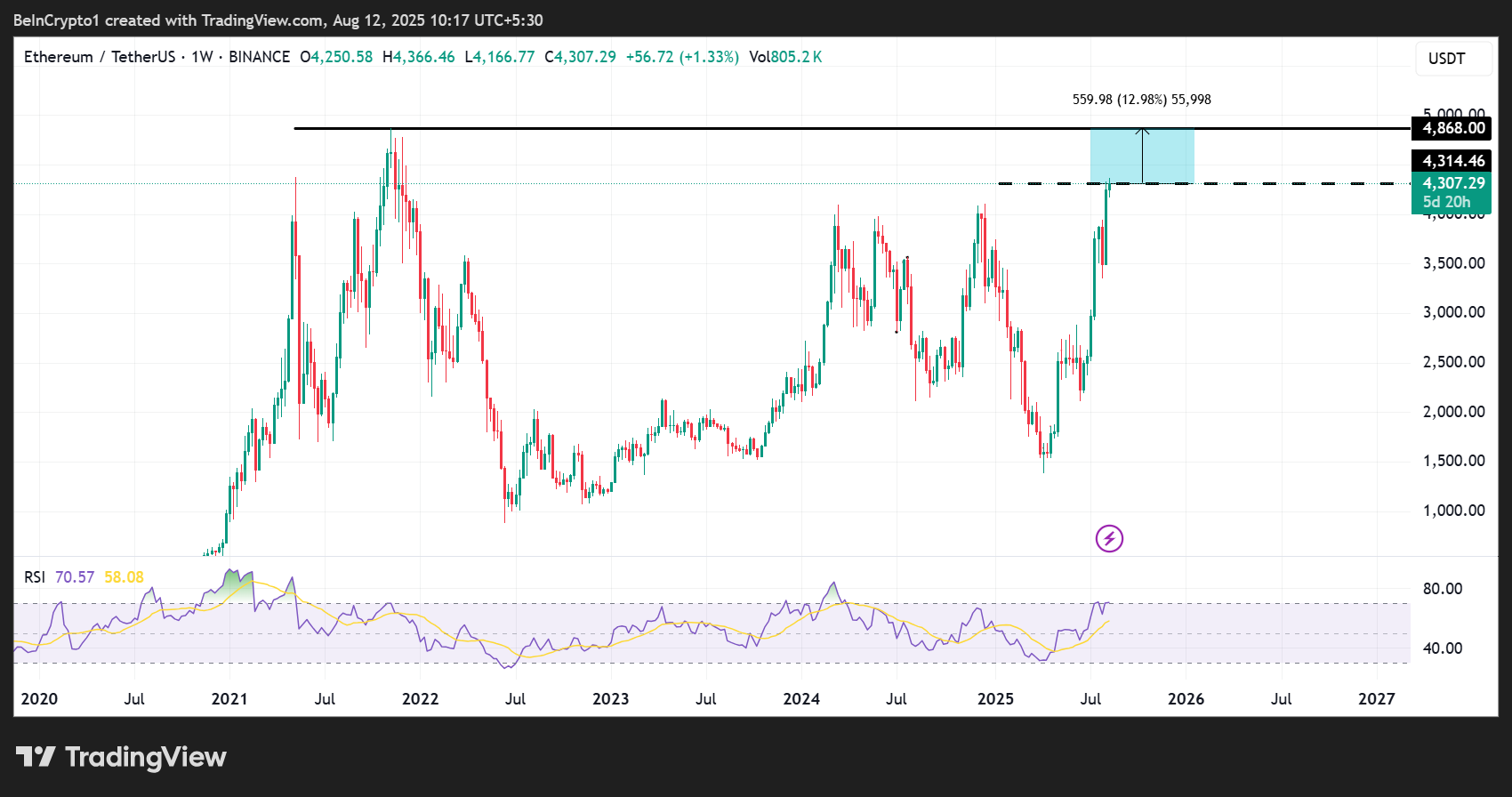 Sijoitukset tulevat, kun Ethereumin hinta ylittää 4 300 dollaria, mikä on lähes 13 % alle sen kaikkien aikojen ennätyksen 4 868 dollaria, joka kirjattiin 8. marraskuuta 2021.