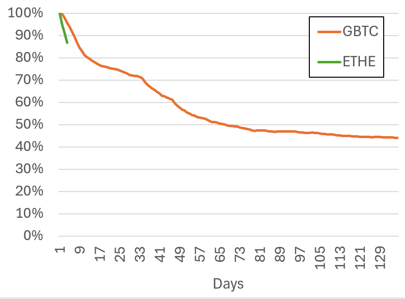 “Prosentuaalisesti, vain kolmen päivän jälkeen, ETHE näyttää menettävän omaisuutta paljon nopeammin kuin GBTC. Positiivisena puolena laskunopeus saattaa taittua pian,” Farside Investors sanoi.