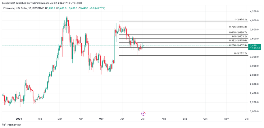 Lehdistöhetkellä ETH vaihtoi omistajaa 3 446 dollarilla. Se on kohdannut vastustusta 3600 dollarin hintatasolla kesäkuun puolivälistä lähtien, minkä vuoksi sen hinta laski 9 % viimeisen kuukauden aikana.