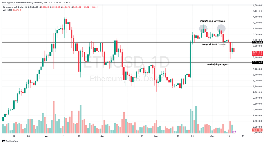 Lisäksi ETH/USD Daily -kaavion tarkastelu näyttää kaksinkertaisen kokoonpanon, jonka katto on 3 885 dollaria. Kaupankäynnissä kaksinkertainen yläosa on laskeva kääntökuvio. Se tapahtuu, kun kryptovaluutta saavuttaa korkean arvon kaksi kertaa peräkkäin samalla kun se rekisteröi lievää laskua kahden huipun välillä.