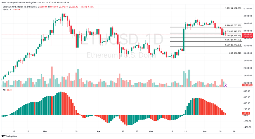 Päiväkaaviossa indikaattorin laskeva lukema viittaa siihen, että ETH liukuu kohti laskuvauhtia. Jos tämä suuntaus jatkuu tai lukema muuttuu negatiiviseksi, Ethereumin hinta voi pudota 3 317 dollariin.
