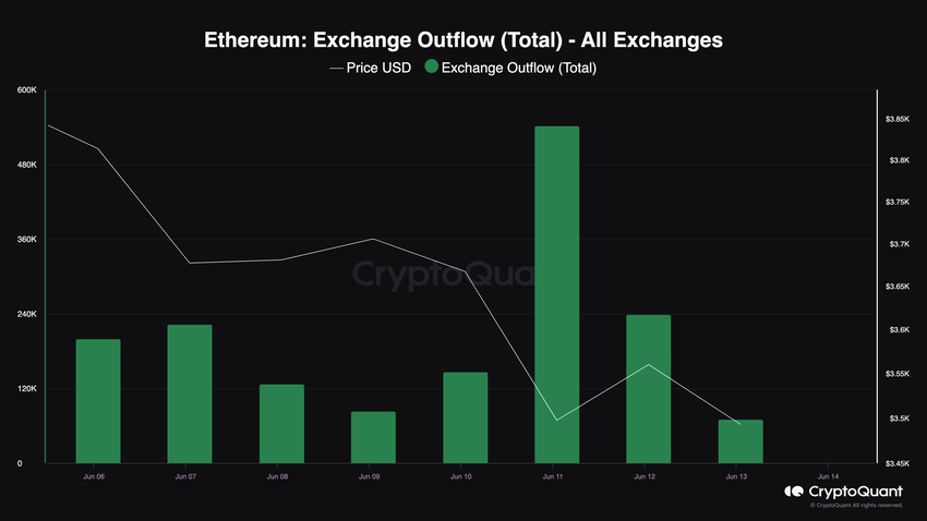 CryptoQuantin tietojen mukaan pörsseistä nostettujen ETH:n määrä on vähentynyt. Esimerkiksi kesäkuun 12. päivänä kirjattu luku laski lähes puoleen edellispäivän luvusta.