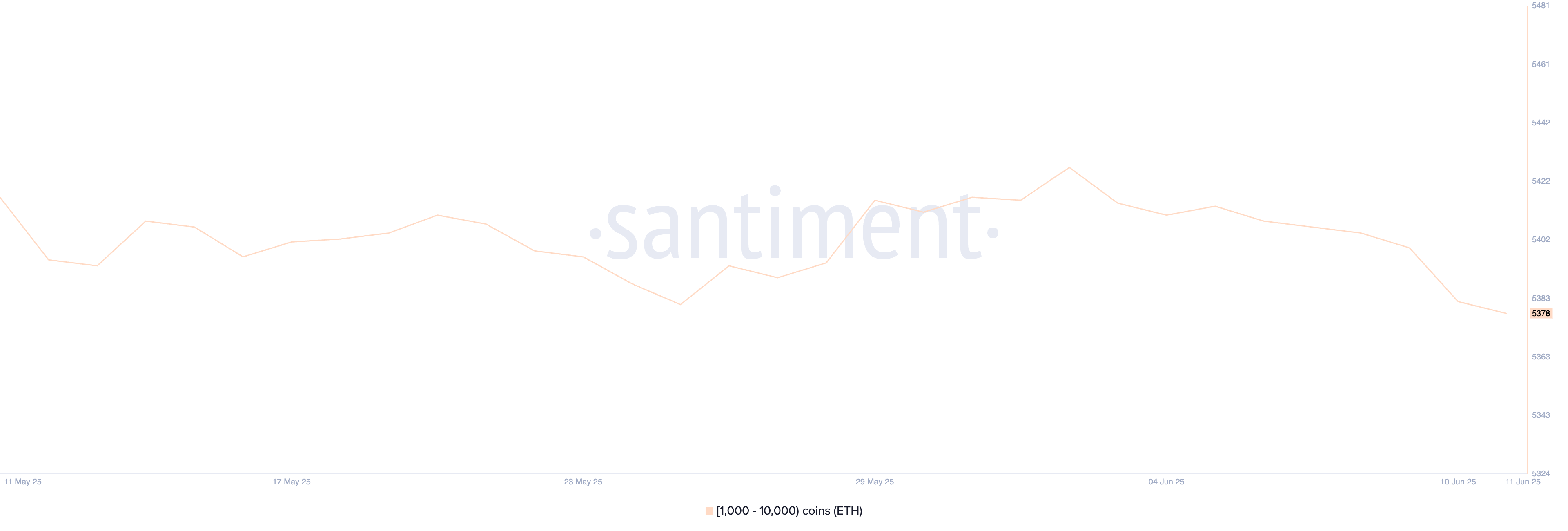 Ethereum-valaiden määrä—lompakot, joissa on 1 000–10 000 ETH:ta—on laskenut tasaisesti 5 378:aan, kun se oli kymmenen päivää sitten 5 427 ja kolme päivää sitten 5 400.