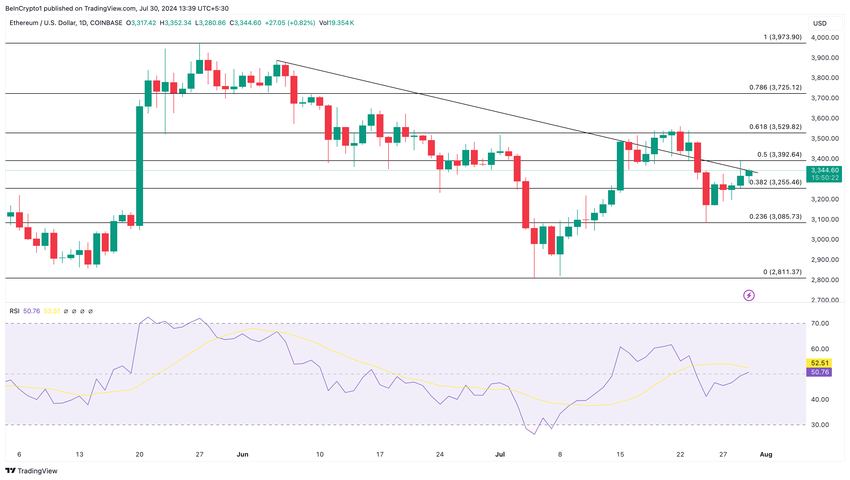 Päivittäisen kaavion mukaan ETH näyttää valmiilta vastustamaan myyntiaaltoa. Tämä johtuu siitä, että altcoinin hinta on lähellä murtautua laskevista trendiviivoista päivittäisessä kaaviossa. Jos tämä tapahtuu, ETH:n arvo voi nousta 3 392 dollariin ja sen jälkeen yrittää saavuttaa 3 529 dollaria.