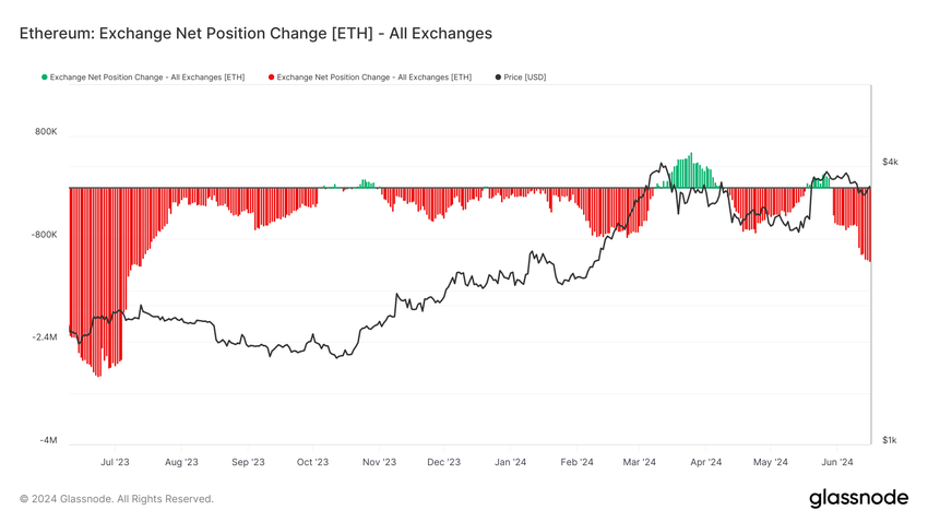 Ethereumin hinnalla voi olla mahdollisuus kiivetä listoille pian, kun ETH:n haltijat jatkavat kertymistä. Pörssin nettoposition muutos osoittaa, että ulosvirtaukset ovat hallinneet markkinoita kuun alusta lähtien. Viimeisen kolmen viikon aikana yli 1,1 miljoonaa ETH:ta, joiden arvo on yli 3 miljardia dollaria, on siirretty pois.