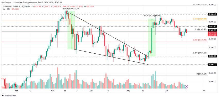 Ethereumin hinta kamppailee kääntääkseen 50 %:n Fibonacci Retracement -tason tukilattiaksi. Tämä taso, jonka arvo on 3 582 dollaria, antaisi ETH:lle mahdollisuuden aloittaa elpyminen ja saada takaisin äskettäin menettämänsä voitot.