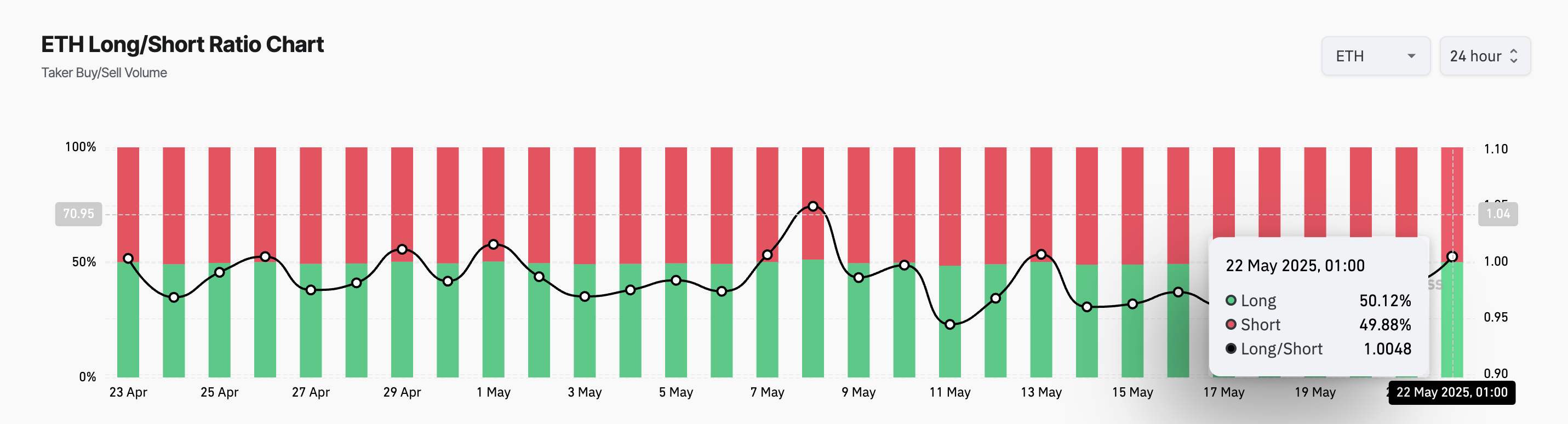 Kysyntä ETH:n pitkille positioille on ylittänyt lyhyet ensimmäistä kertaa 11 päivään, mikä merkitsee merkittävää muutosta kauppiaiden asemoinnissa. Coinglassin mukaan ETH:n long/short-suhde on noussut yli 1:n, mikä osoittaa, että useammat kauppiaat nyt panostavat hinnan nousuun. Kirjoitushetkellä tämä on 1,0048.