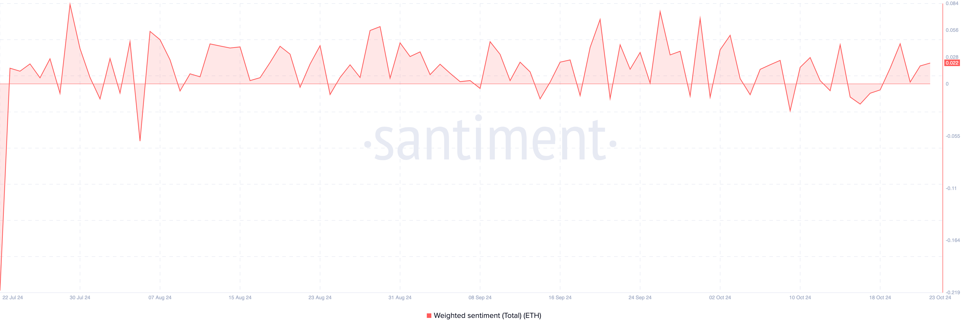 Painotettu tunnelma on toinen tunnusluku, joka viittaa siihen, että ETH:n hinta voisi palautua. Tämä tunnusluku mittaa markkinaosallistujien käsitystä kryptovaluutasta. Kun se kasvaa, yleinen tunnelma on härkämäinen ja se voi johtaa kysynnän kasvuun.