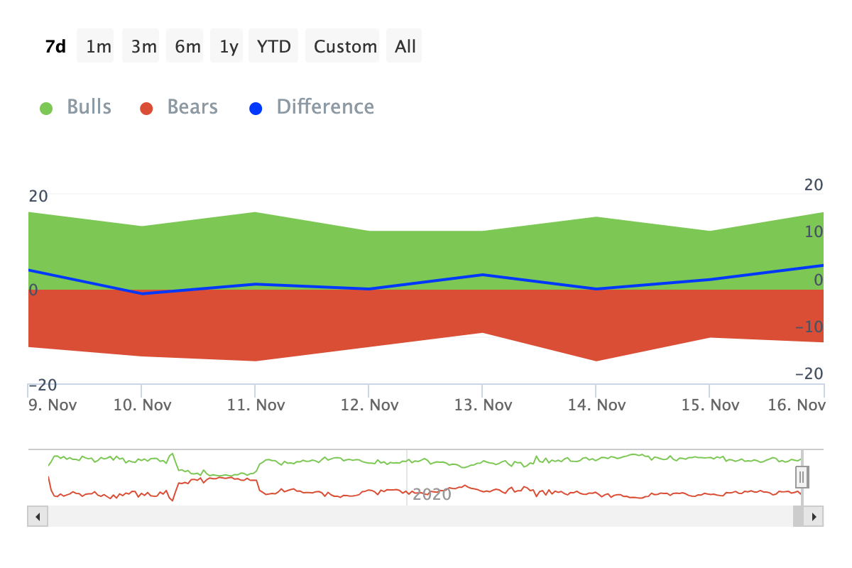 IntoTheBlockin tiedot paljastavat, että ETH härät työskentelevät aktiivisesti hinnan ylläpitämiseksi. Tämä käy ilmi Härät ja Karhut -indikaattorista, joka seuraa, ostavatko vai myyvätkö osoitteet, jotka käyvät kauppaa vähintään 1% kryptovaluutan volyymista, pääasiassa.