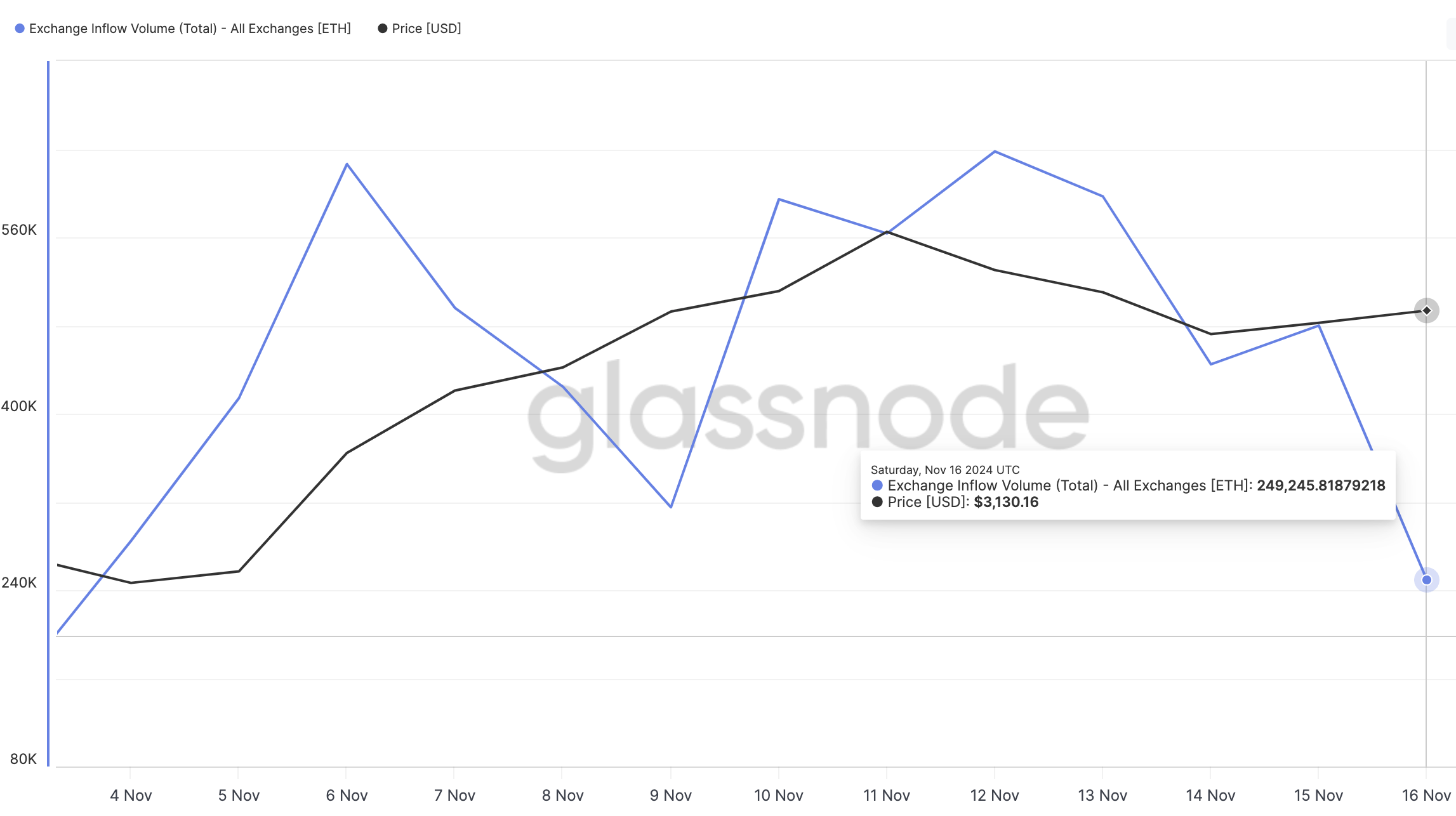 Glassnoden mukaan kokonais Ethereum-sijoitukset ovat 249 245 Tätä kirjoitettaessa. Sijoitukset ovat kolikoiden määrä, jotka on lähetetty pörsseihin tietyn ajanjakson aikana. Kun tämä tunnusluku kasvaa, se tarkoittaa, että useammat omistajat ovat valmiita myymään, mikä voi olla karhumainen merkki kryptovaluutalle.