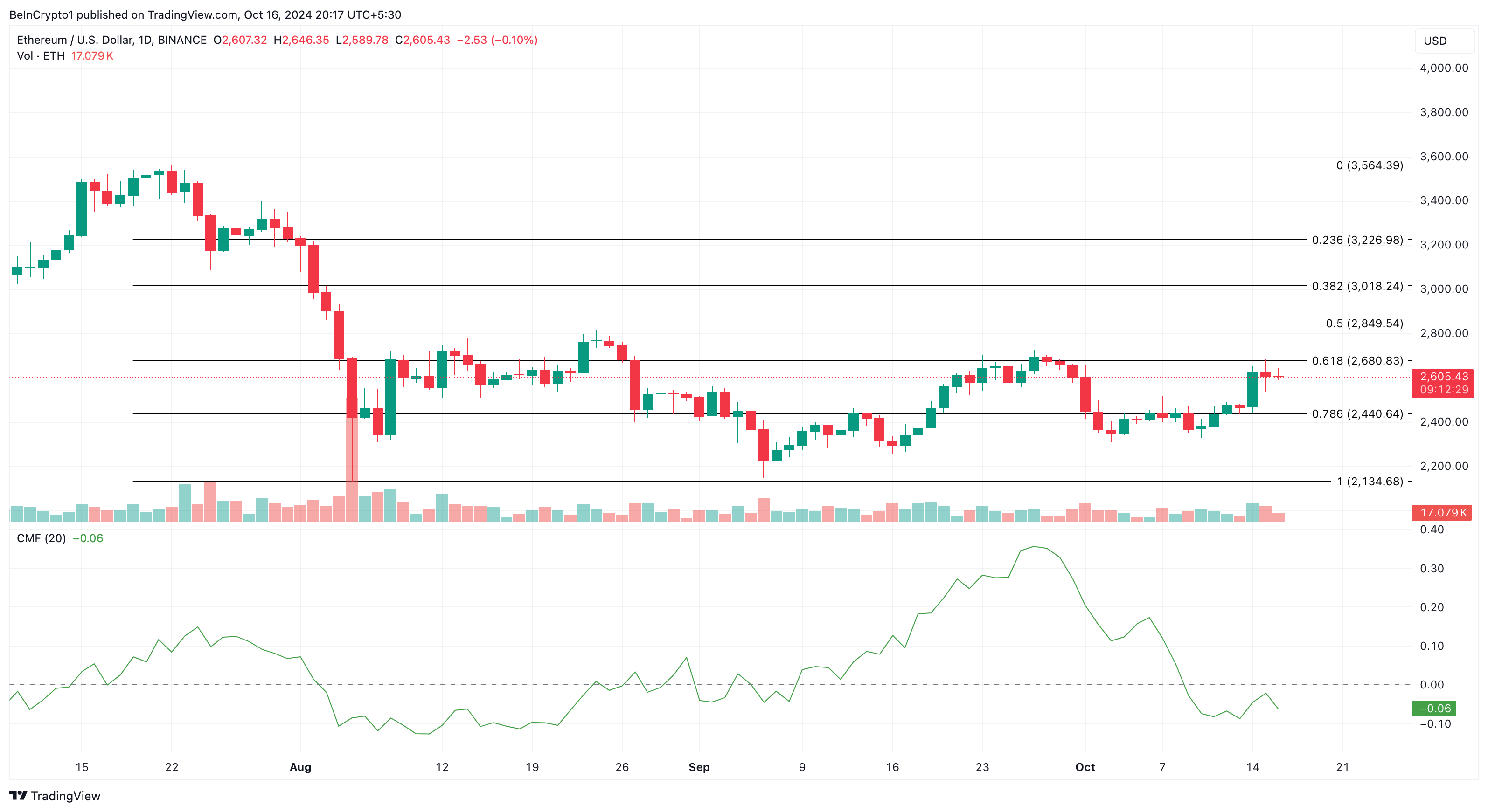 Päivittäisessä kaaviossa Chaikin Money Flow (CMF) on laskenut nollaviivan alapuolelle. CMF on tekninen oskillaattori, joka mittaa kertymistä ja jakautumista markkinoilla. Kun se kasvaa, kertyminen hallitsee, mikä viittaa siihen, että hinta voi nousta.