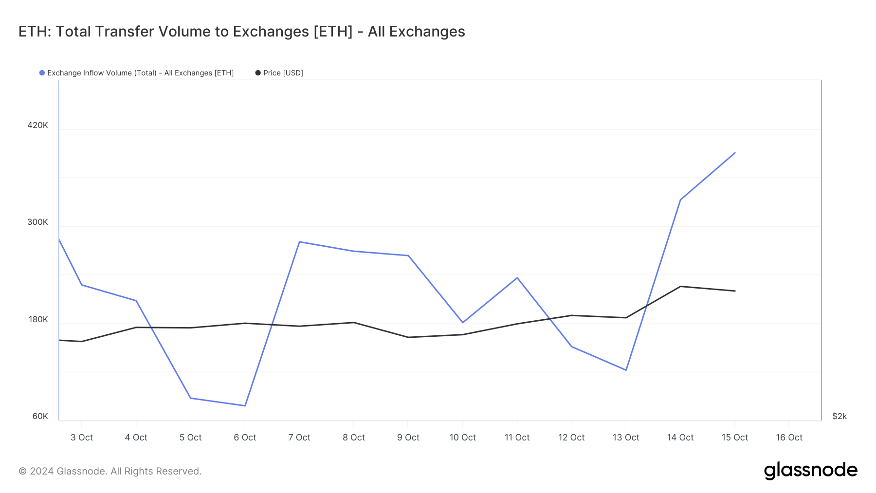 Lokakuun 13. päivänä Glassnode-tiedot paljastivat, että pörsseissä oli 122 164 ETH. Tätä kirjoitettaessa luku on kuitenkin noussut 390 432 ETH:iin. Nykyisellä ETH:n hinnalla tämä edustaa yli miljardin dollarin arvoa.