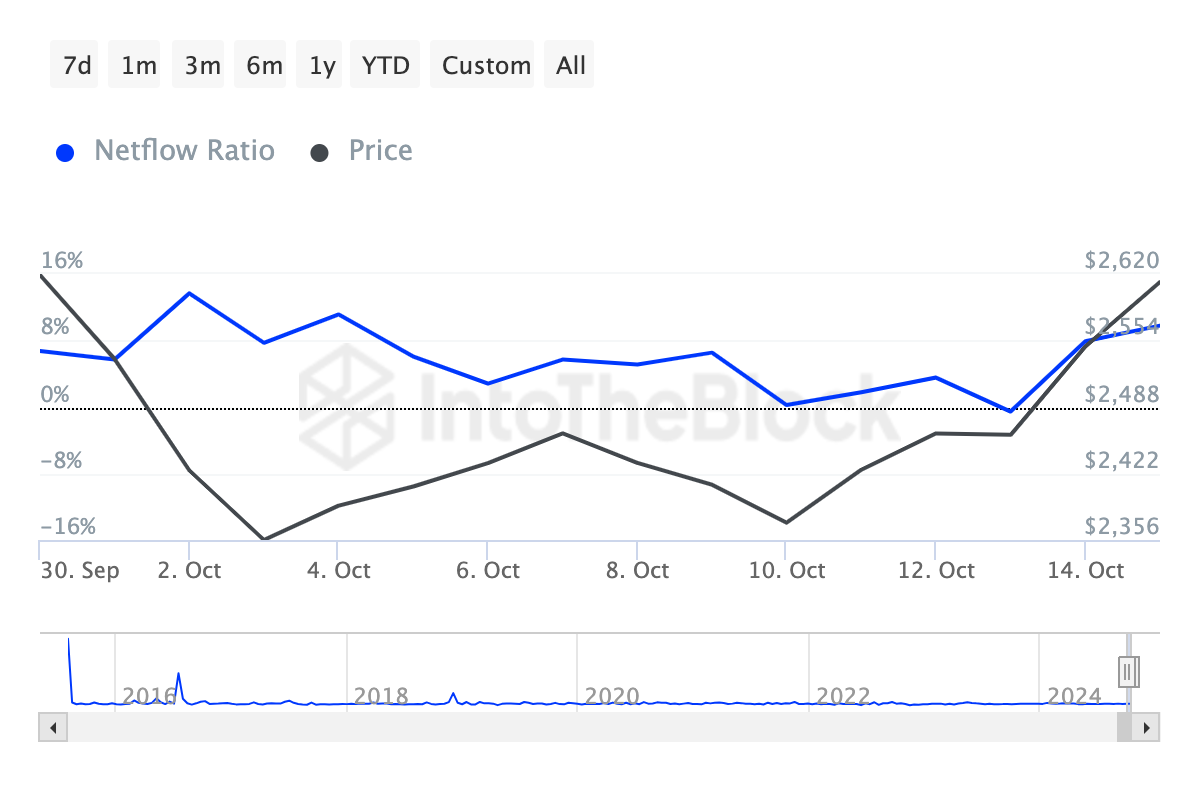 Lisäanalyysi lohkoketjussa viittaa siihen, että kryptovalaiden toiminta on osaltaan vaikuttanut Ethereumin äskettäiseen hintalaskuun. IntoTheBlockin mukaan suurten omistajien nettovirta pörssiin -suhde on kasvanut viimeisen seitsemän päivän aikana.