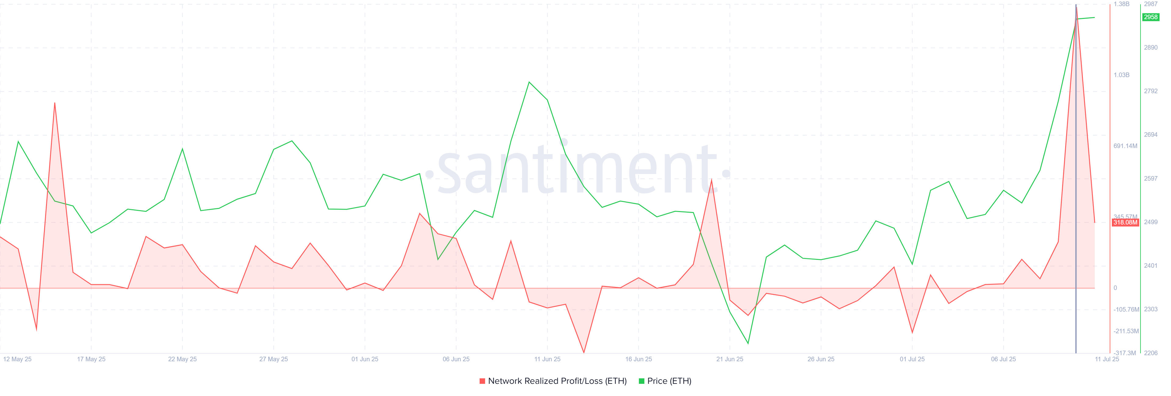 Ethereumin verkon toteutunut voitto/tappio -tunnusluku on noussut 1,36 miljardiin dollariin, mikä on suurin kasvu sitten joulukuun 2022. Tämä jyrkkä nousu toteutuneissa voitoissa osoittaa merkittävää myyntipainetta.