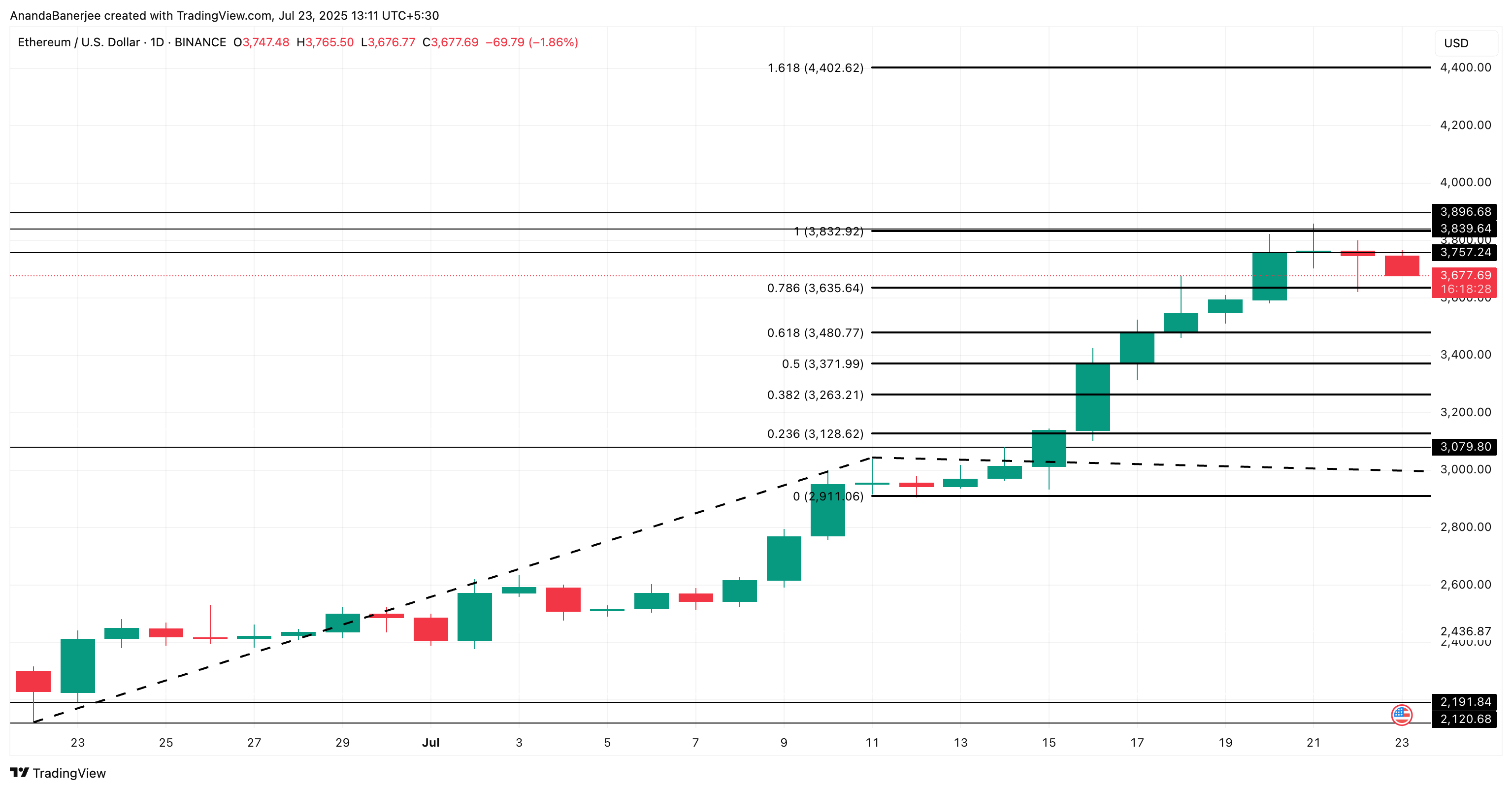 Koko lyhyen aikavälin härkähypoteesi saattaa kuitenkin mitätöityä, jos ETH-hinta laskee alle 3 128 dollarin tai 0,238 Fib-laajennustason.