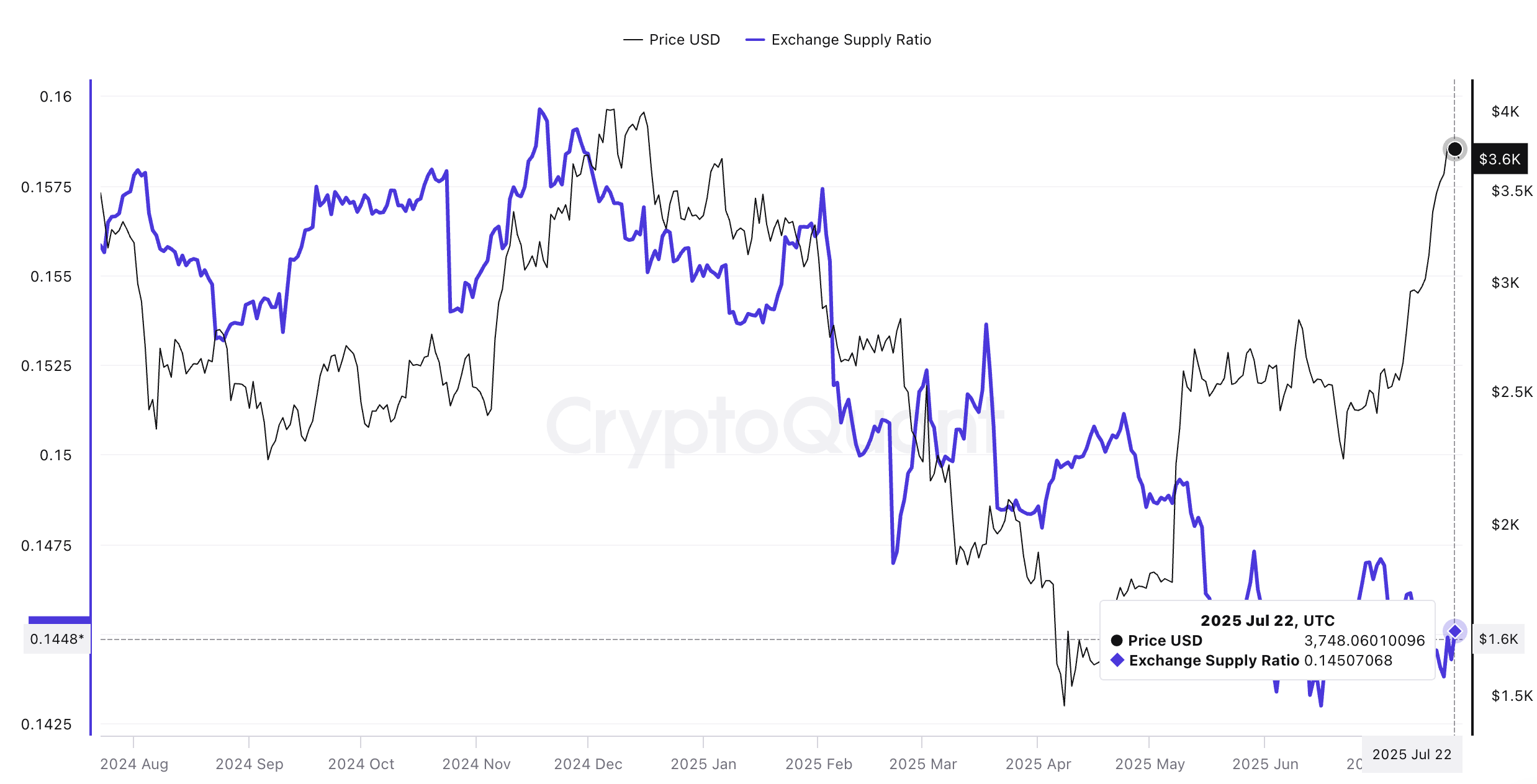 Exchange Supply Ratio (ESR) on noin 0,145, lähellä tämän vuoden alinta arvoa 0,142. Suhdelukua käytetään raakojen pörssitasapainojen sijaan, koska se mittaa pörssin hallussa olevia varoja suhteessa liikkeessä olevaan ETH:iin, joka muuttuu panostamisen, polttamisen ja avaamisen myötä.