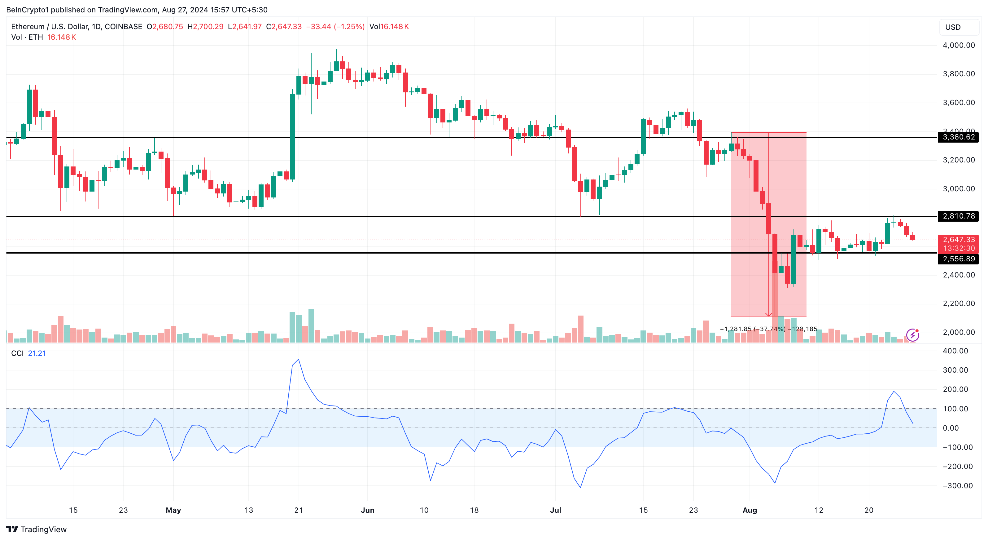 Ethereumin päivittäinen kaavio paljastaa jyrkän laskutrendin elokuun alussa, kun ETH:n hinta laski 3 392 dollarista 2 109 dollariin. Viime viikkoina kryptovaluutta on kuitenkin siirtynyt konsolidaatiovaiheeseen, mikä osoittaa monimutkaisen tilanteen, jossa markkinat ovat epävarmoja seuraavasta siirrosta.