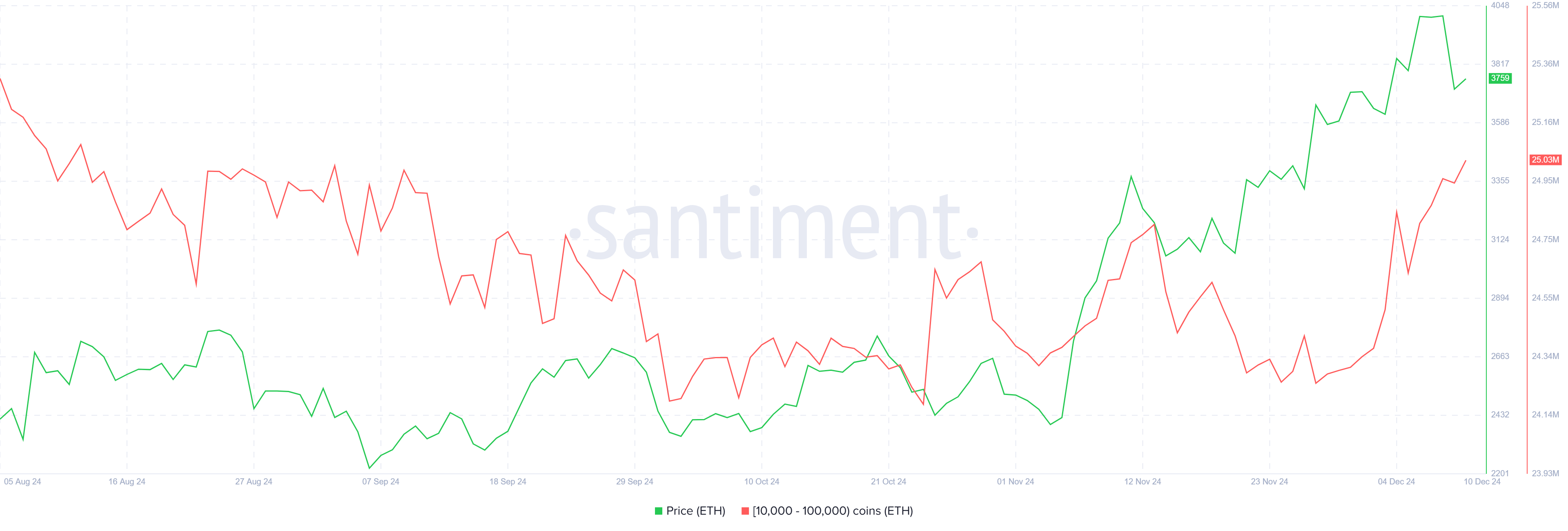 Valasosoitteet, jotka pitävät hallussaan 10 000–100 000 ETH:ta, ovat osoittaneet vahvaa keräämistä viimeisten viiden päivän aikana, ostamalla yhteensä 400 000 ETH:ta, joiden arvo on yli 1,5 miljardia dollaria. Tämä merkittävä kerääminen korostaa, että suuret lompakon haltijat luottavat edelleen Ethereumin pitkän aikavälin kasvuun.