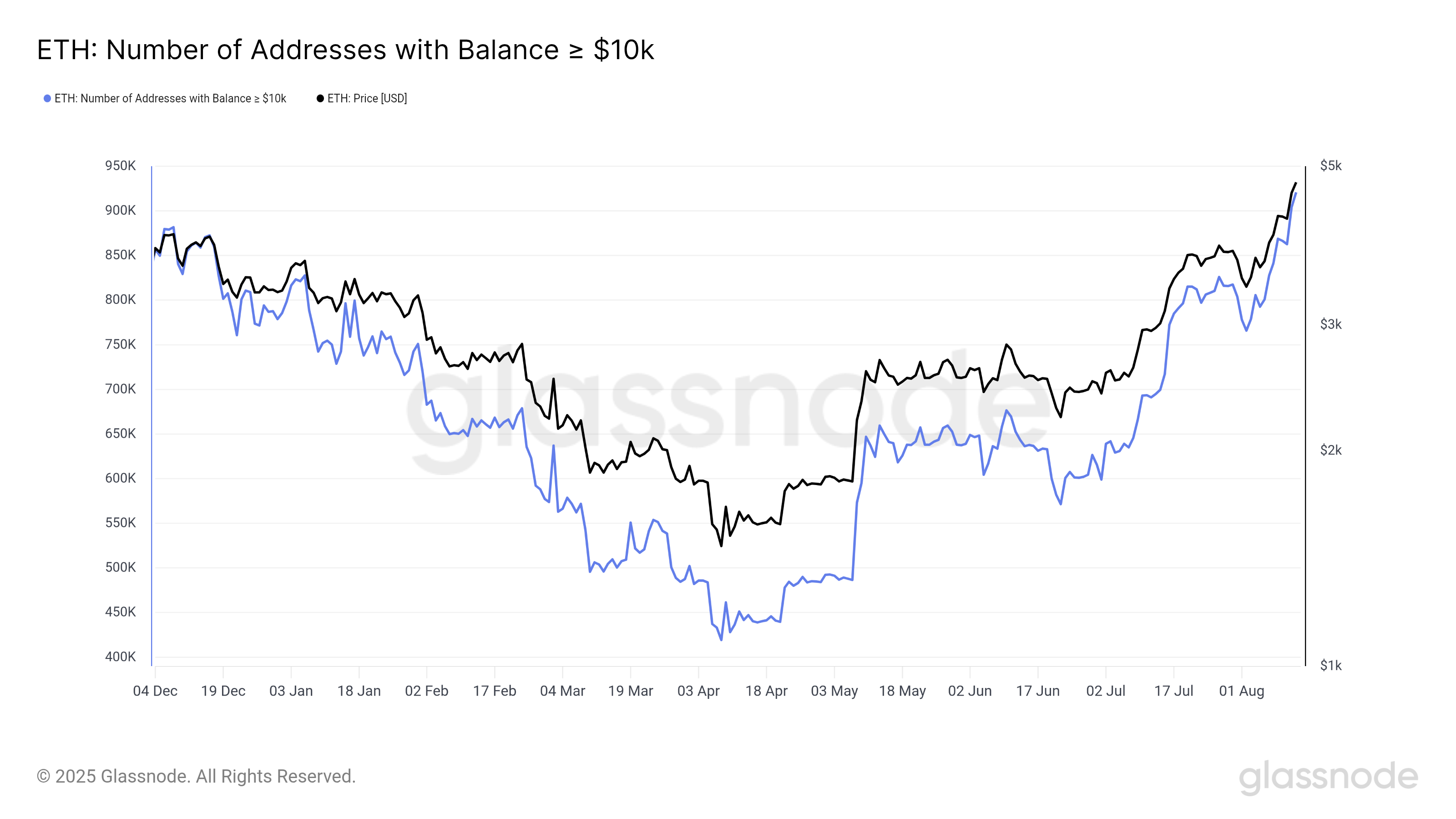 Ethereum-hinnan noususuuntaus saa tukea vahvasta omistajakunnasta. Tiedot osoittavat, että yli 10 000 dollarin arvoisia ETH-saldoja pitävien osoitteiden määrä on kasvanut. Tämä luku on nyt ylittänyt 920 000, mikä on korkein taso vuoden alusta lähtien.
