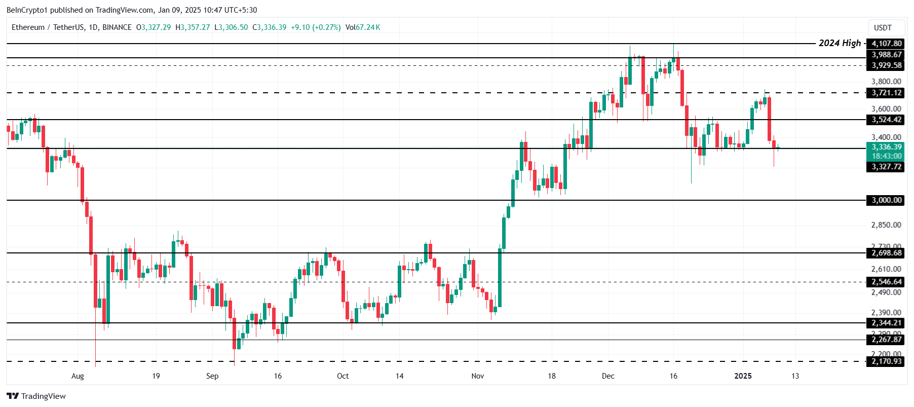 Ethereumin hinta on tällä hetkellä 3 336 dollaria, laskenut 9 % tällä viikolla epäonnistuttuaan murtautumaan 3 721 dollarin vastustason läpi. Lasku pakotti ETH:n testaamaan 3 327 dollarin tukitasoa, joka on kriittinen lisätappioiden välttämiseksi. Sijoittajien sekava tunnelma on luonut vetovoiman toipumistoiveiden ja myyntipaineen välille.