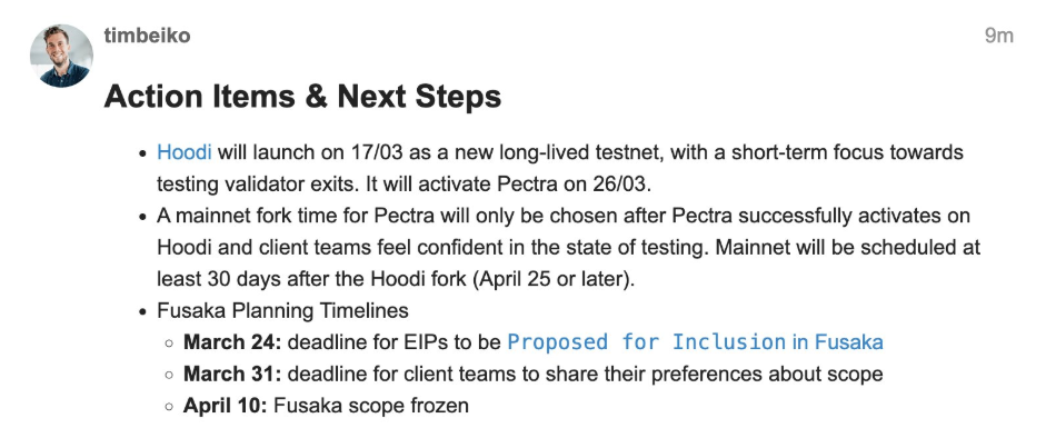 “Uusi testiverkko, Hoodi, käynnistyy maanantaina Pectra-testauksen viimeistelemiseksi. Jos sinun täytyy testata validaattorin poistumisia, pidä silmällä sitä! Kaikki muu voidaan testata Sepoliassa ja Holeskyssä. Pectra aikataulutetaan 30+ päivää Hoodin onnistuneen haarukan jälkeen, odottaen infrastruktuuri- ja asiakastestausta. Fusaka-suunnittelu etenee rinnakkain, ja EIP-ehdotusten määräaika on 24. maaliskuuta, ja alustava päivämäärä 10. huhtikuuta laajuuden jäädyttämiselle,” Beiko totesi.
