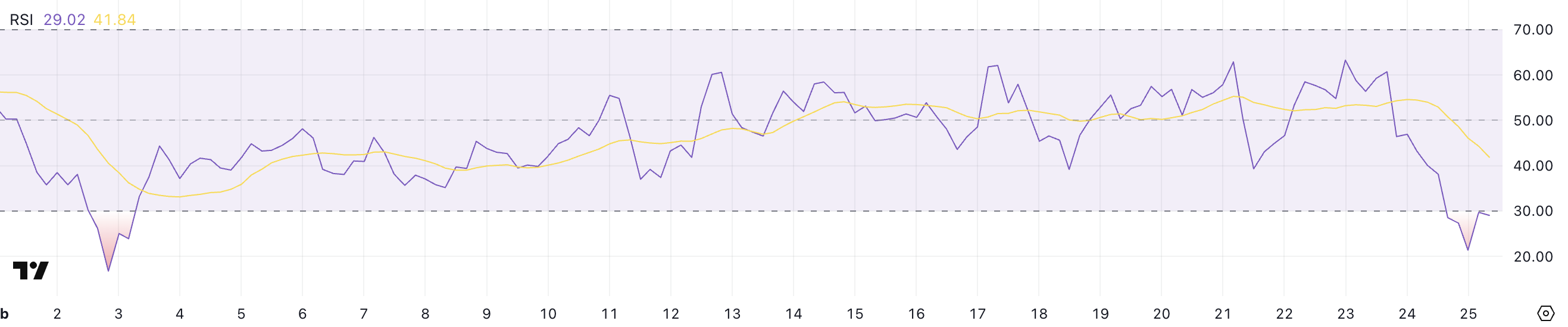 ETH:n RSI on tällä hetkellä 29, kun se putosi 21,3:een muutama tunti sitten. Tämä on ensimmäinen kerta helmikuun 3. päivän jälkeen, kun ETH on siirtynyt ylimyytyyn alueeseen, mikä osoittaa voimakasta myyntipainetta.
