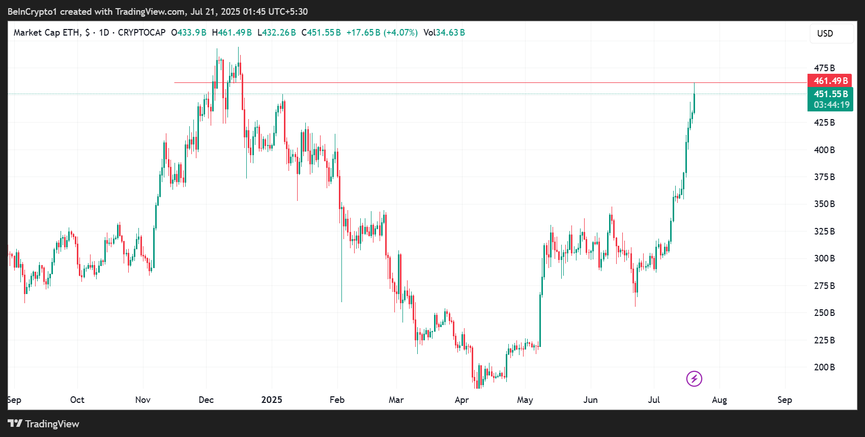 TradingView’n tiedot osoittavat, että Ethereumin markkina-arvo nousi vuoden 2025 huippuun 461,49 miljardia dollaria, ennen kuin se korjautui hieman 451,55 miljardiin dollariin tätä kirjoitettaessa.