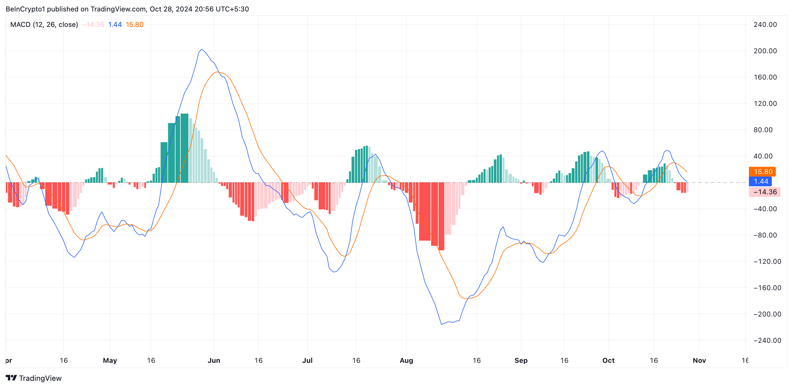 Esimerkiksi sen liikkuvan keskiarvon konvergenssi/divergenssi (MACD) vahvistaa ETH:n kysynnän hidastumisen. Kolikon MACD-linja (sininen) on signaalilinjan (oranssi) alapuolella ja on valmis risteämään nollalinjan alapuolelle.
