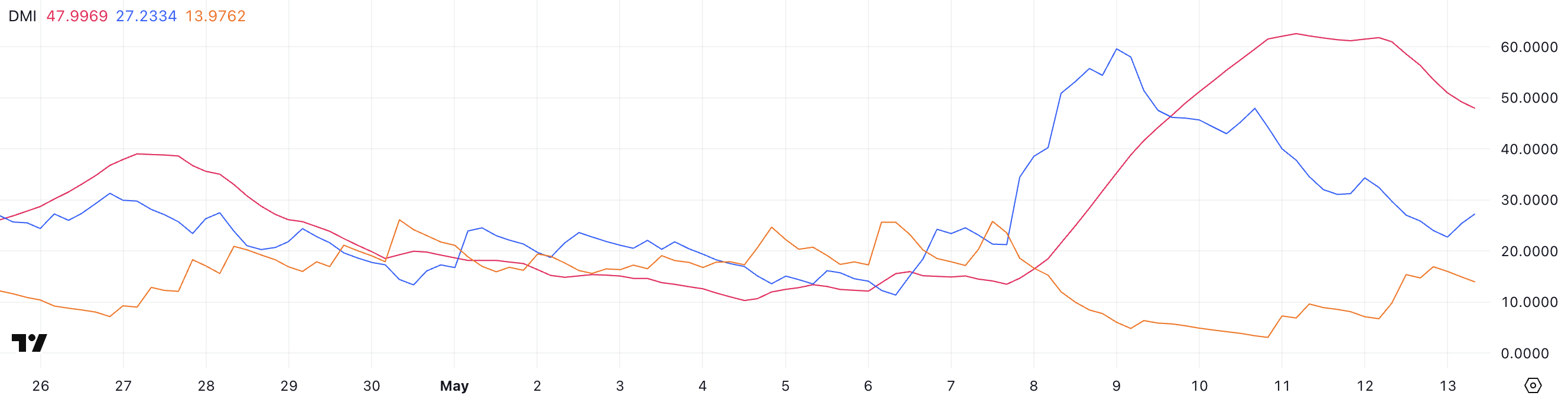 Ethereumin DMI-indikaattori osoittaa, että sen ADX on pudonnut 61:stä 47,99:ään, mikä viittaa heikkenevään trendin vahvuuteen.