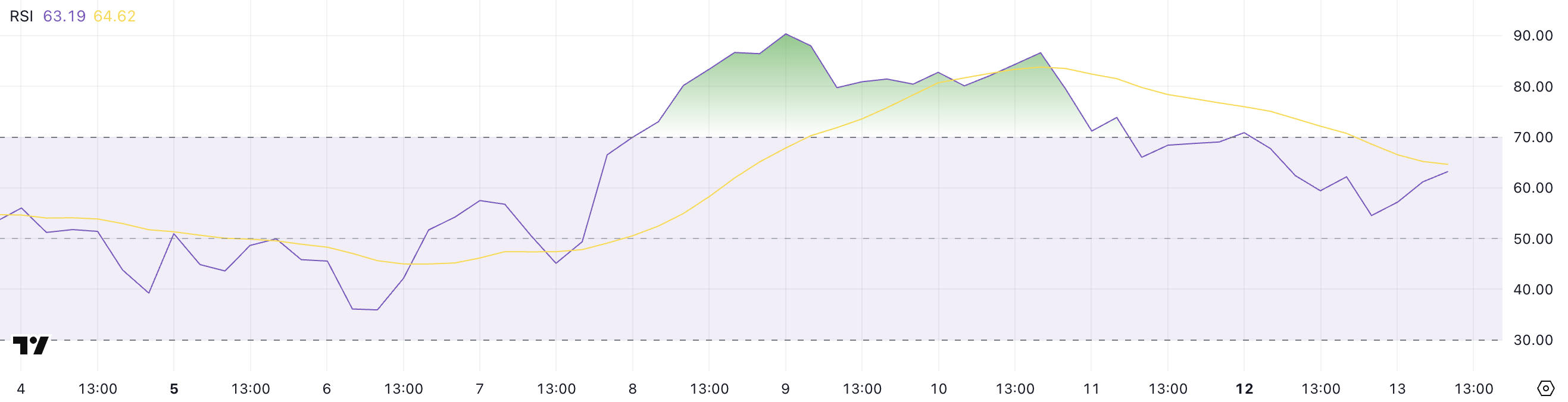Ethereumin RSI on pudonnut 63:een korkeimmasta 86:sta kolme päivää sitten, oltuaan yliostetun kynnysarvon 70 yläpuolella kolme peräkkäistä päivää.