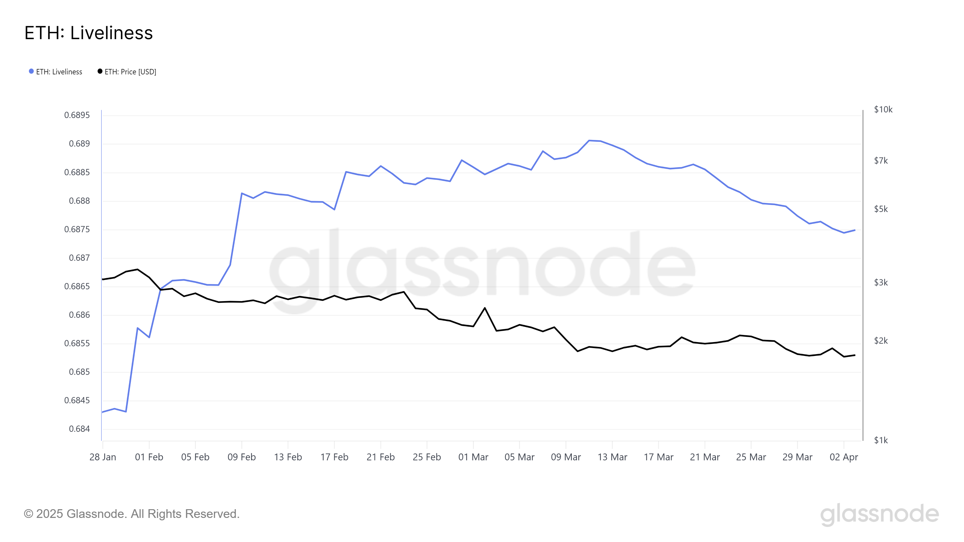 Viimeisen kuukauden aikana Ethereumin Liveliness-indikaattori on laskenut, mikä viittaa siihen, että myyntipaine heikkenee. Liveliness mittaa pitkäaikaisten haltijoiden aktiivisuutta, ja lasku viittaa yleensä keräämiseen myynnin sijaan.