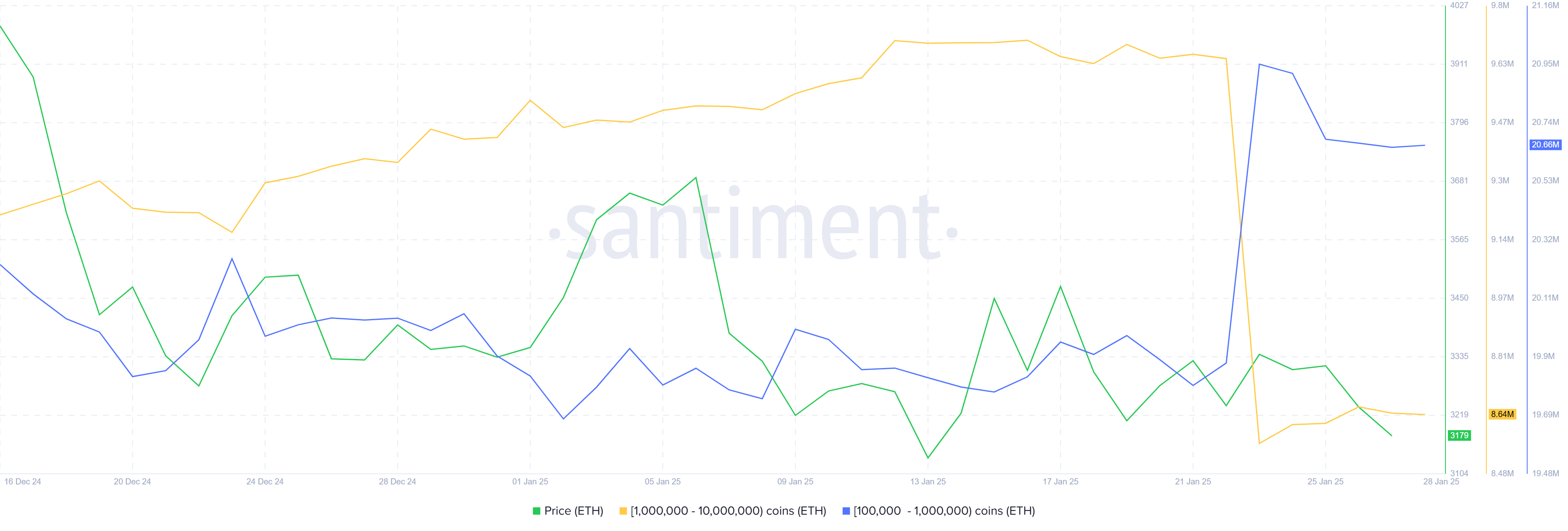 Ethereum-valaiden osoitteet, jotka pitävät hallussaan 100 000–1 miljoonaa ETH:ta, ovat aktiivisesti hankkineet suurempien lompakonhaltijoiden myymää ETH:ta. Viikonlopun aikana tämä ryhmä osti 1,1 miljoonaa ETH:ta, arvoltaan noin 3,5 miljardia dollaria, yhden päivän aikana. Heidän ostovimmansa nähdään pyrkimyksenä vakauttaa kryptovaluutta.