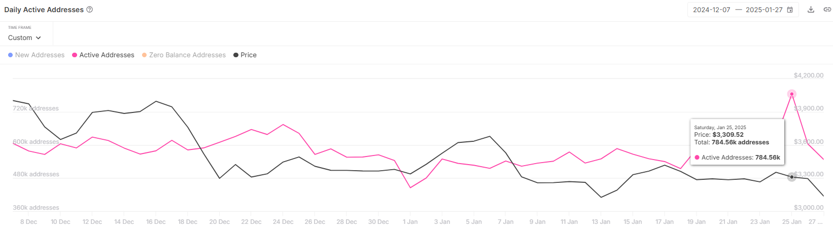 Ethereumin makrotunnelma näyttää ristiriitaisia signaaleja. Aktiivisten lompakko-osoitteiden määrä nousi äskettäin 784 000:een, mikä heijastaa lisääntynyttä aktiivisuutta. Tämä luku kuitenkin laski jyrkästi 547 000:een pian sen jälkeen, mikä viittaa kasvavaan epävarmuuteen sijoittajien keskuudessa jatkuvien markkinaromahduksen pelkojen keskellä.
