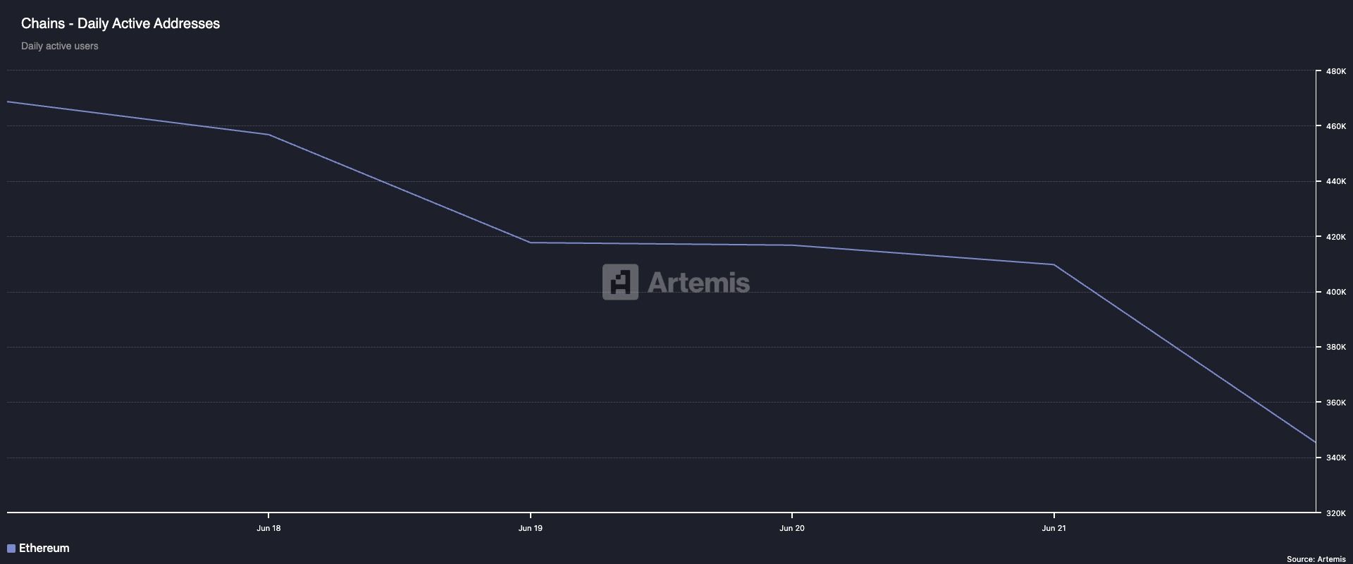 Osallistumisen väheneminen ennakoi usein laajempaa hidastumista verkon toiminnassa, mikä näkyy Ethereumin transaktiomäärässä, joka on myös laskenut. Artemiksen mukaan se on pudonnut 14% tarkastelujakson aikana.