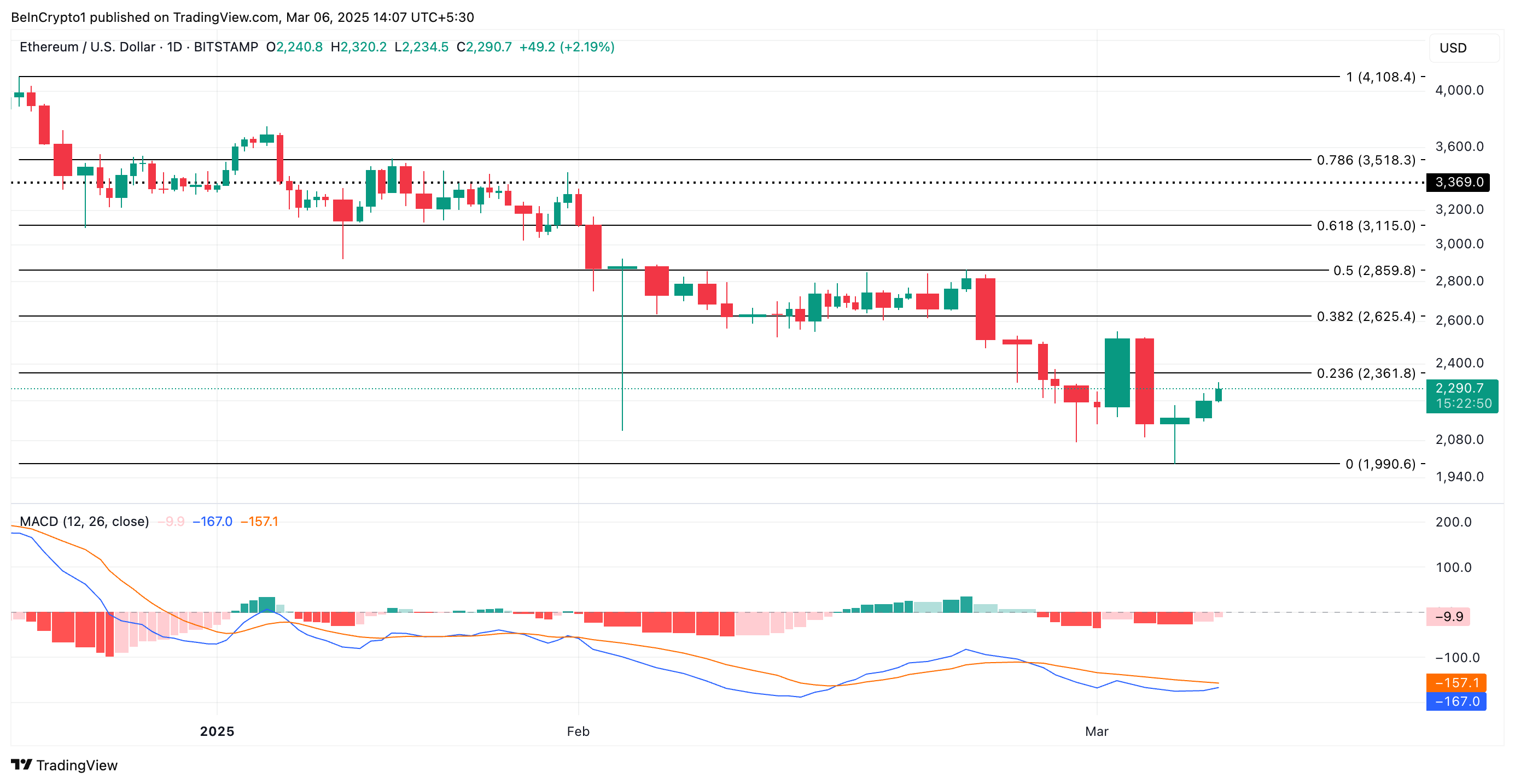 Kirjoitushetkellä ETH:n hinta on 2 290 dollaria, mikä merkitsee 4 % hinnannousua viimeisen 24 tunnin aikana. Kasvavan härkäpaineen myötä laajemmilla markkinoilla ennen kokousta altcoin saattaa jatkaa nousuaan lyhyellä aikavälillä.