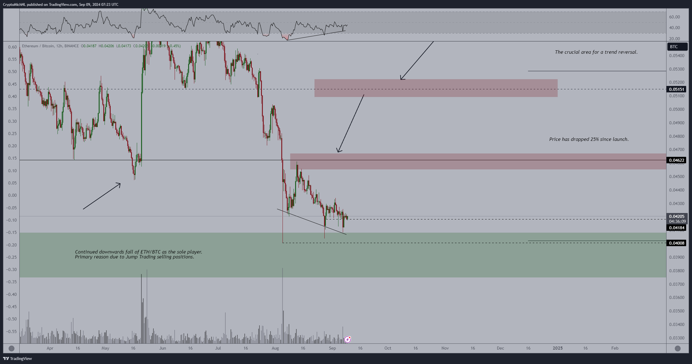 Tämä on merkittävää, koska ETH:n hinta putosi takaisin kiilaan juuri ennen kuin Yhdysvaltain keskuspankki ilmoitti ensimmäisestä korkoleikkauksestaan yli vuosikymmeneen. Kun keskuspankki toteutti korkoleikkauksen, ETH putosi kiilan alapuolelle, mikä aiheutti jyrkän hinnan laskun, ja ETH/BTC-pari saavutti pohjansa.