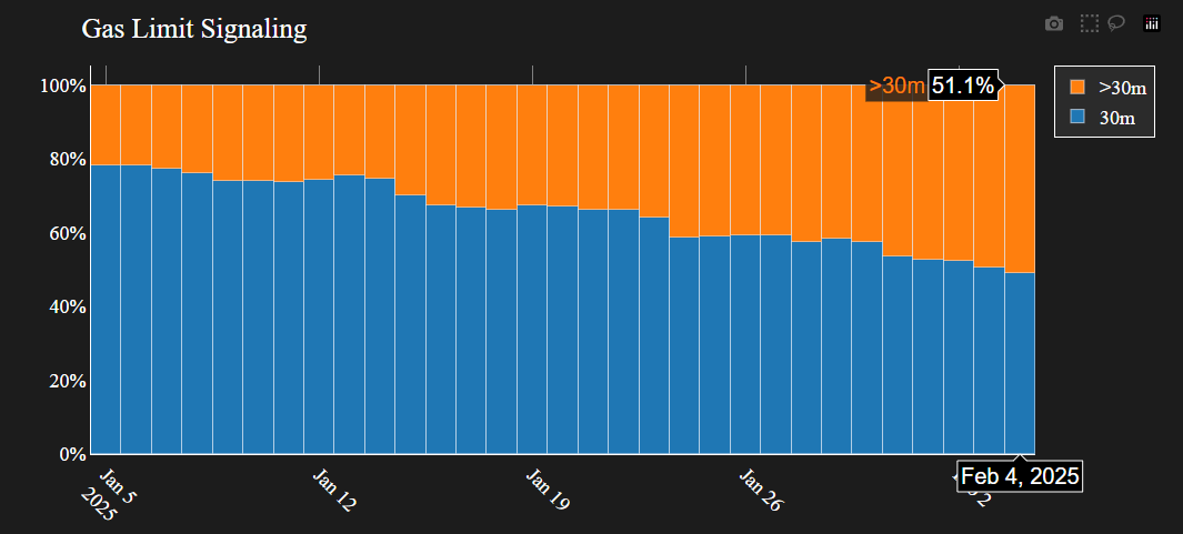 Samaan aikaan Ethereumissa käydään toista kriittistä keskustelua kaasurajan nostamisesta. Ethereumin kaasuraja on ylittänyt 32 miljoonaa, ja lähes 52 % validoijista ilmaisee tukensa korotukselle.
